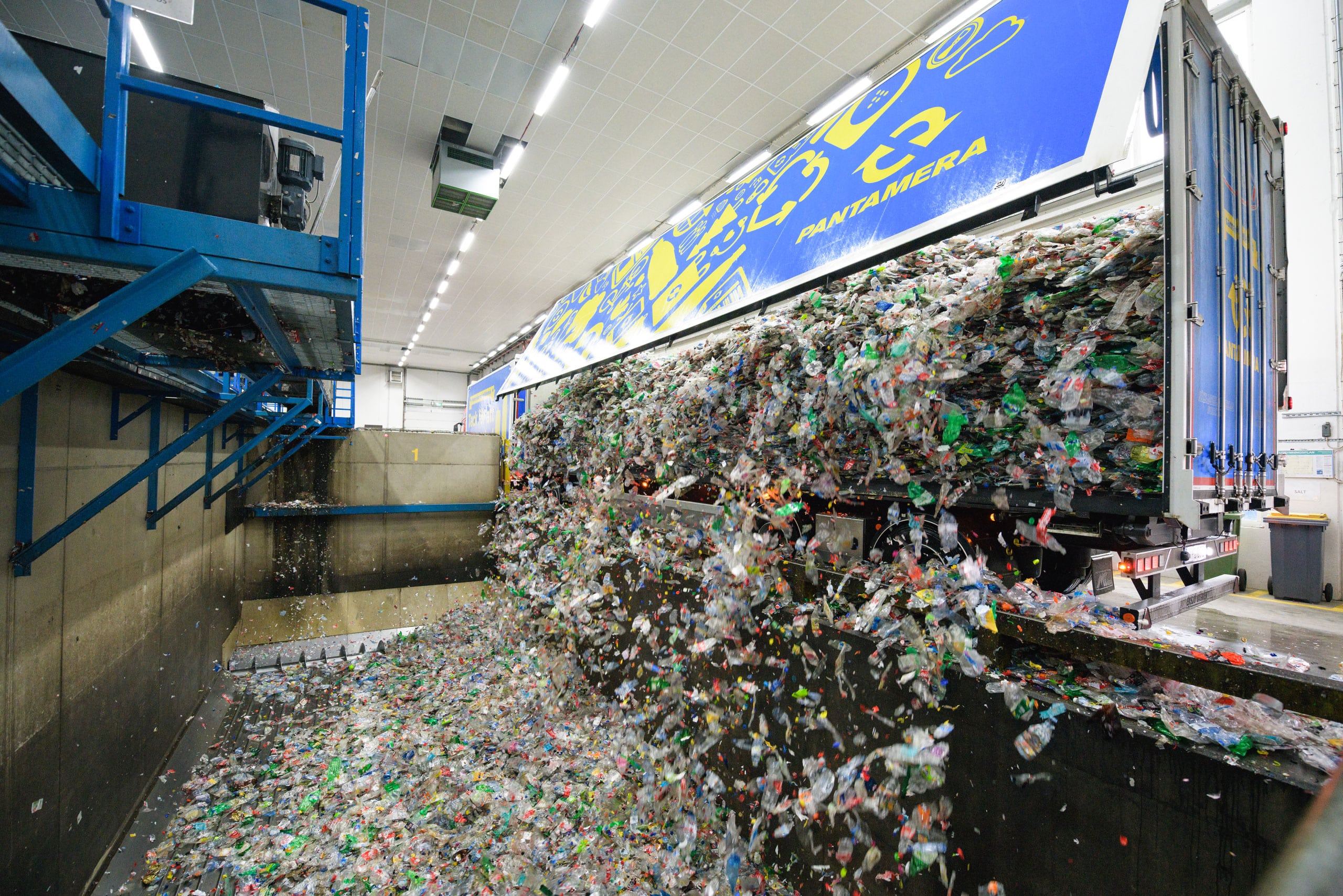 When trucks arrive at the factory, the contents are emptied into designated pits – two pits for PET, one for aluminium – before then being transported along different conveyor belts and on into the factory.