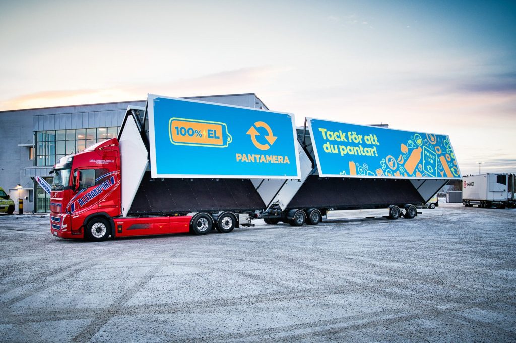 Bottles and cans are compressed inside the deposit machine first so that they take up as little space as possible. These are then collected by compactor trucks (two-compartment trucks), transported to an intermediate warehouse, and then picked up by larger trucks and driven to the factory in Norrköping.